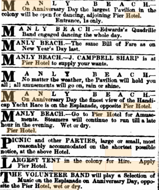 MANLY BEACH - This favourite place of public resort on holidays was visited yesterday by a large number of pleasure seekers The steamship a Kiama, Breadalbane and Phantom, were chartered, and continued running throughout the day of using the list trip from Manly shortly after dusk. The Iarge saloon at the Pier Hotel was thrown open for dancing, and for which a band was in attendance, leaving nothing, to be desired the votaries of the scheme The chief feature the day' s fun, however, was the sports under the auspices of Messrs Lawrence and Brown, all of which were entered into with zest, while some caused a considerable amount of merriment among the spectators. Prizes were awarded to the successful competitors in each instance. DOWN THE HARBOUR. (1866, April 3). The Sydney Morning Herald (NSW : 1842 - 1954), p. 5. Retrieved from http://nla.gov.au/nla.news-article13128927
