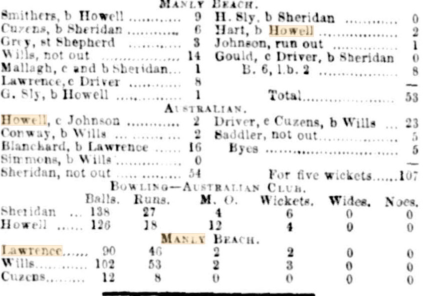 A one innings match was played between these clubs on Saturday. In the absence of Lawrence, Wills, with the view of making an even contest, played for Manly Beach, who, in their innings, scored the large total 129, of which Wills contributed 56 (not out), and all the eleven, more or less, succeeded in scoring. The bowling of Cuzens was again worthy of praise, as was also the judicious manner in which Mullagh acted as captain.