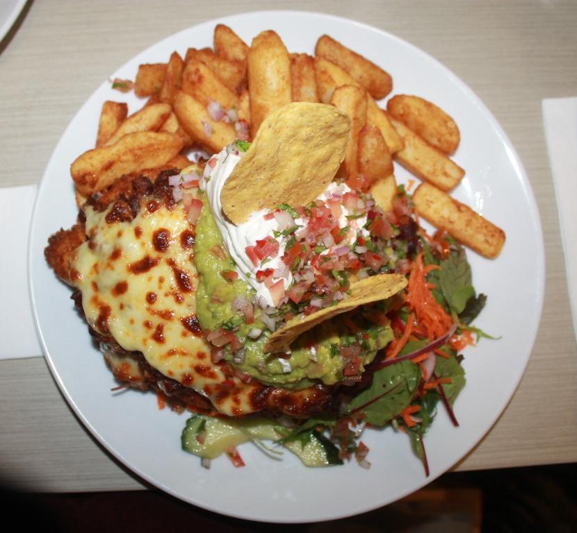 Mexican Parmagiana: fresh chicken schnitzel topped with nachos mix (mild chilli con carne and melted cheese), guacamole and sour cream plus fresh slas, served with yummy fresh salad and beer battered chips