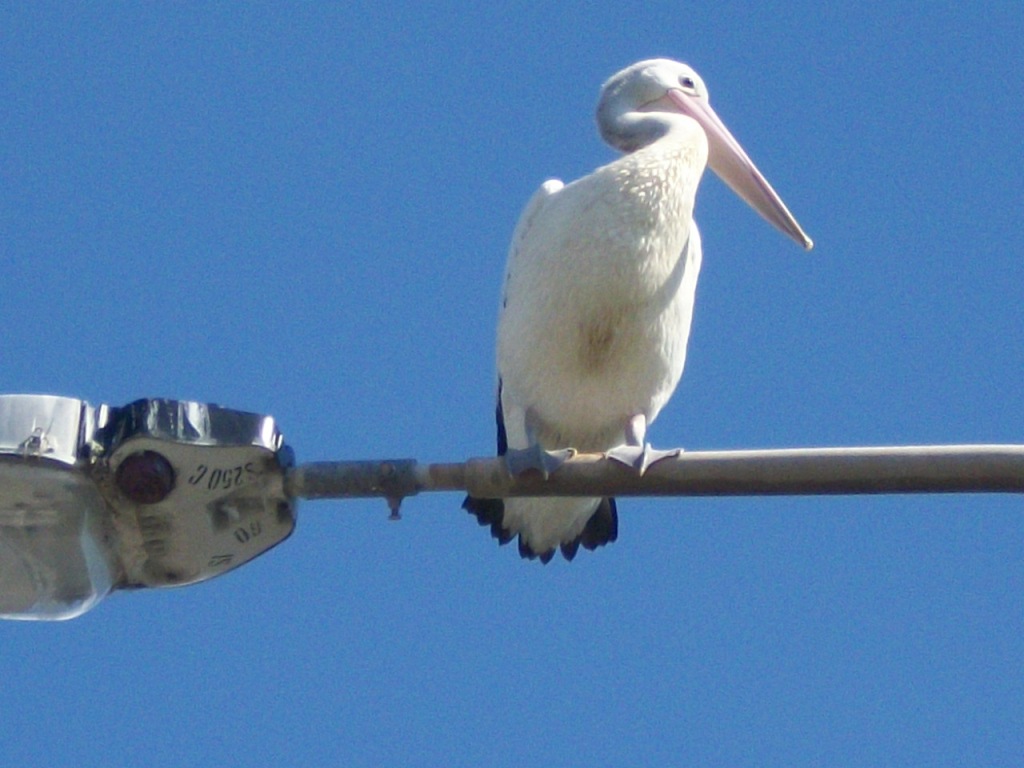 Four pelicans are frequently seen perching on the lamps that light the bridge over Narrabeen lagoon. The pelicans which are also, and incidentally, an ancient symbol of change, seem quite happy overseeing the roar of traffic below.
