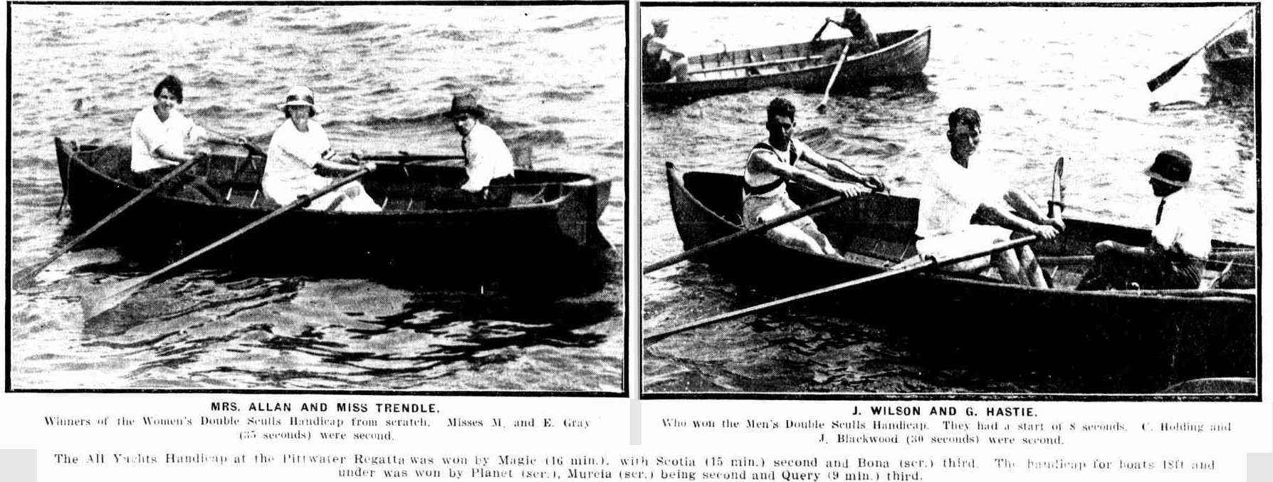 J. WILSON AND G. HASTIE, Who won the Men's Double Sculls Handicap. They had a start of 8 seconds. C. Holding and T. Blackwood (3(1 seconds) were second. The All Yachts Handicap at the Pittwater Regatta was won by Magic (16 min.), with Scotia (15 min.) second and Bona (scr.) third. The handicap for boats 18ft and under was won by Planet (scr.), Murcia (scr.) being second and Query (9 min.) third. THE DAVIS CUP CONTEST: WON BY AMERICA. (1921, January 5). Sydney Mail (NSW : 1912 - 1938), p. 24. Retrieved from http://nla.gov.au/nla.news-article159037882