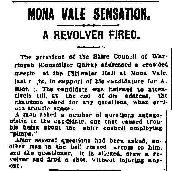 MONA VALE SENSATION. (1914, January 16). Evening News(Sydney, NSW : 1869 - 1931), p. 7. Retrieved from http://nla.gov.au/nla.news-article114489161