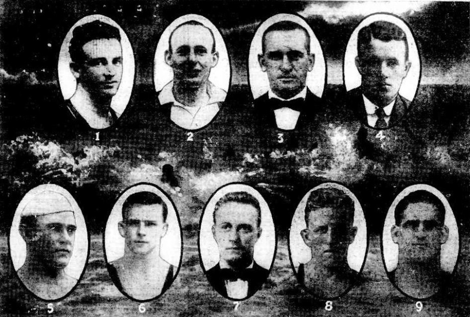 The men in the picture are: No. 1, R. Riley (Coogee) ; 2, Alex Jones (Curl Curl); 3, J. Blackwood (Mona Vale); 4, A. H. Curlewis (Palm Beach); 5, W. Hill (Queenscliff) ; 6, T. Meagher (Bondi); 7, D. Murray (Dee Why); C. Ward (Cook's Hill); 9, H. Fletcher (Bondi). SOME NOTED N.S.W. SURF SWIMMERS WHO HAVE DONE GOOD WORK THIS SEASON. (1924, March 21). Arrow (Sydney, NSW : 1916 - 1933), p. 1. Retrieved from http://nla.gov.au/nla.news-article103540567