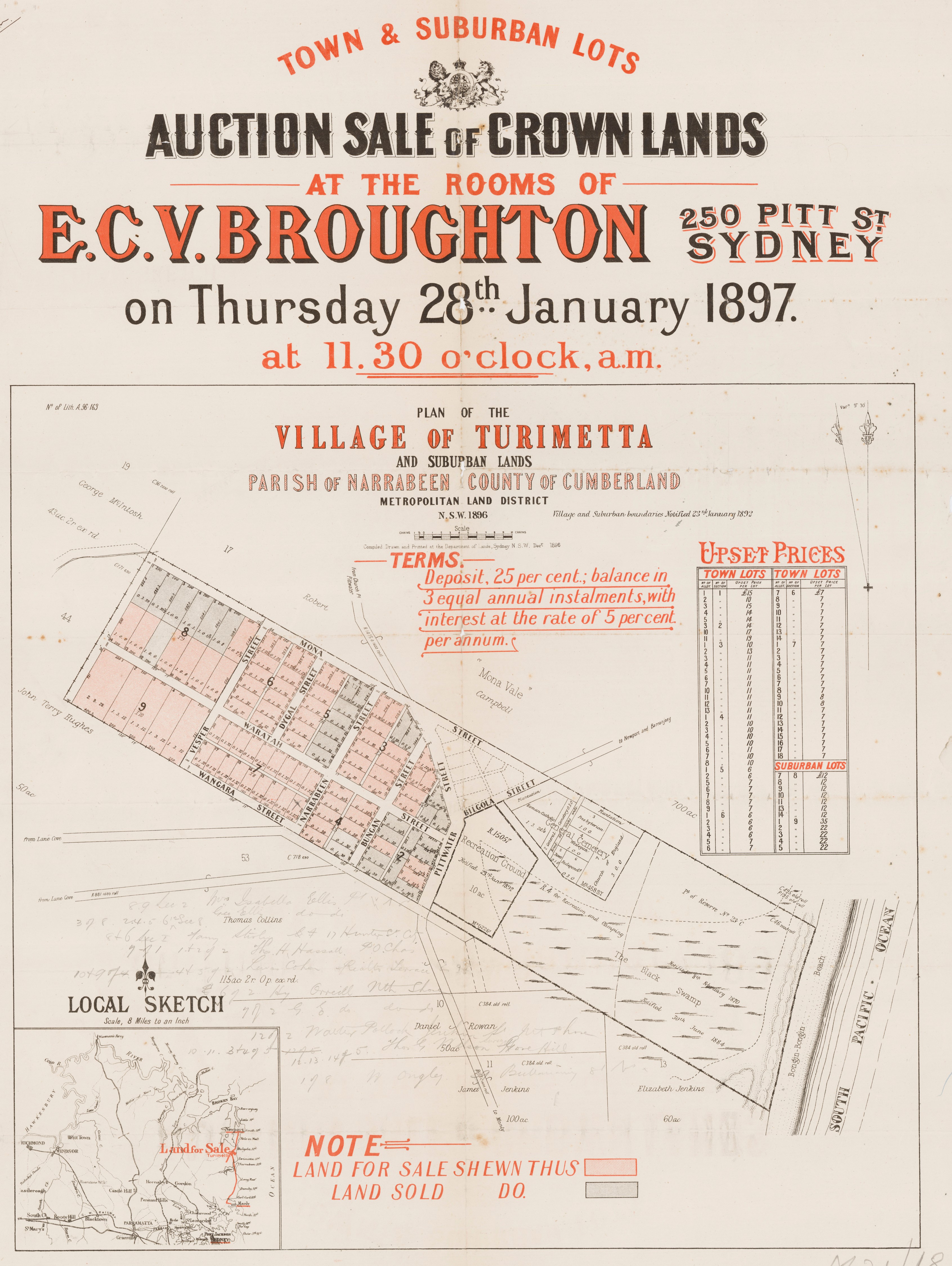 Crown Land Sale. As announced in our advertising columns, Mr. E.C. V. Broughton, under instructions from the Minister for Lands, will conduct a Crown land sale at his rooms, 250 Pitt-street. The land to be offered comprises sixty-six blocks in the village of Turimetta, adjoining the Rock Lily Hotel, Pittwater. Areas, from ½ s to nearly 3s. Upsets, from £6 to £22 per lot.. Terms, quarter cash, balance in three equal annual payments, interest 5 per cent. From the inquiry, evinced it is anticipated that a successful sale will result. Crown Land Sale. (1897, January 27). Evening News (Sydney, NSW : 1869 - 1931), p. 3. Retrieved from http://nla.gov.au/nla.news-article108861575