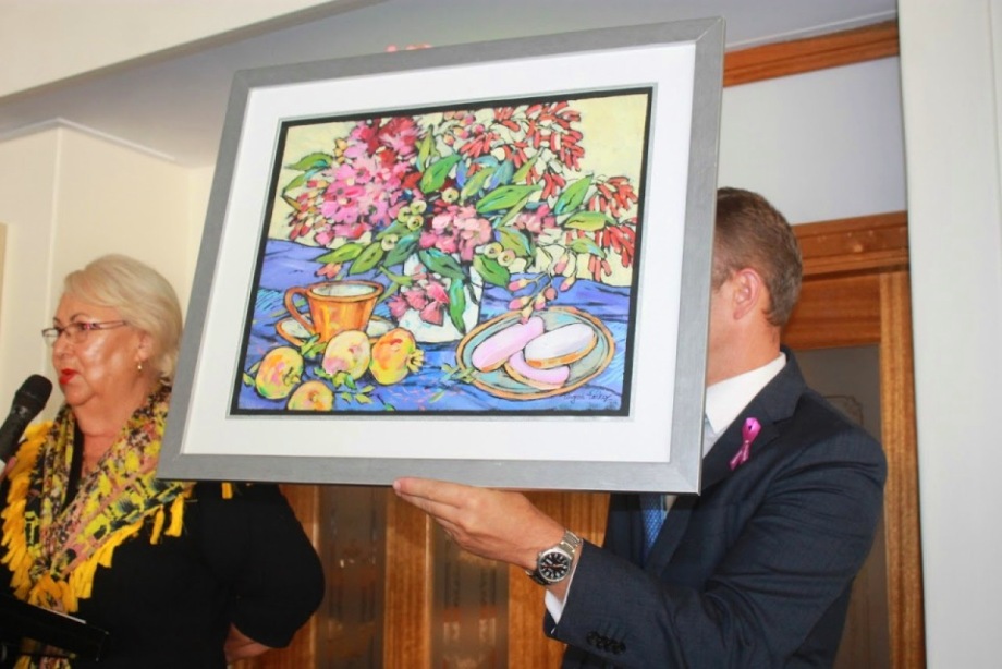Mrs. Morgan had brought a beautiful painting by Mignon Parker with her to give to the Zonta Club to raffle, as shown here by Pittwater’s MP Rob Stokes. Zonta will be able to feature Mignon’s work in a future promotion to raise more funds to put towards their wonderful works.