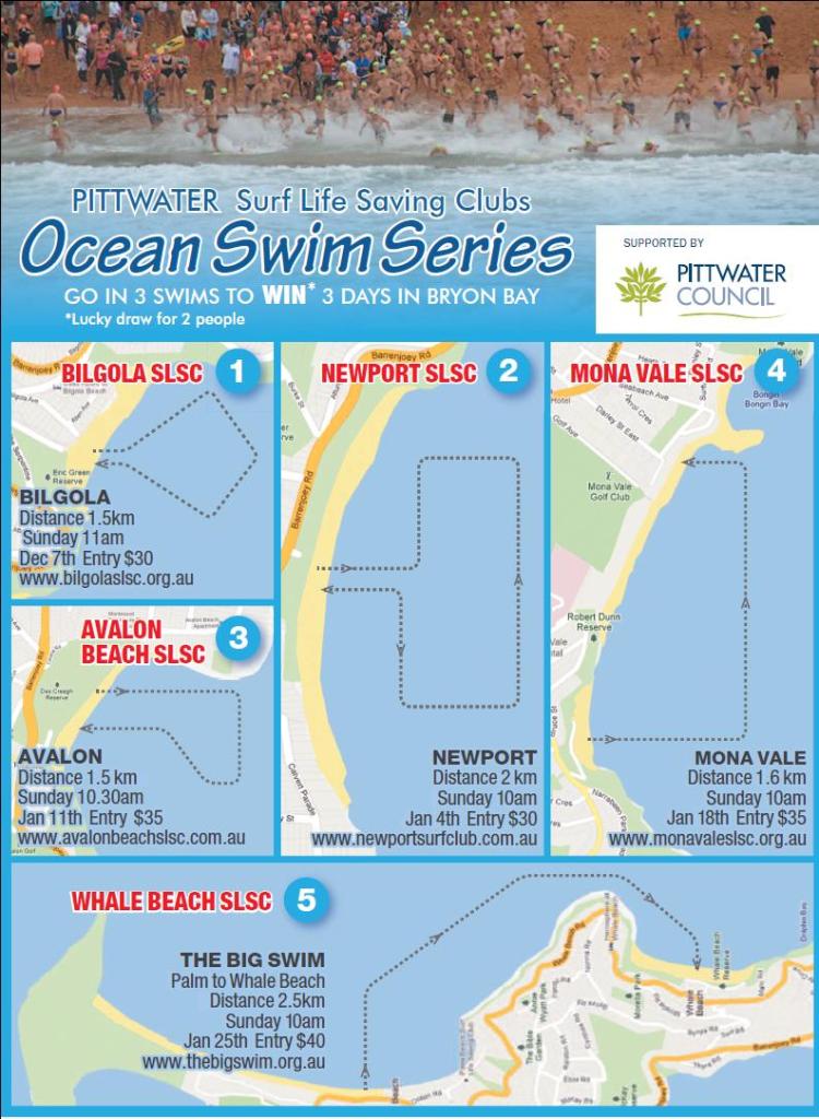 The Bilgola ocean swim will be held on Sunday 7 December followed by Newport on 4 January, Avalon 11 Jan., Mona Vale 18 Jan., and the Palm Beach to Whale Beach (The Big Swim) on 25 January. Entries for the swims will be available on www.oceanswims.com