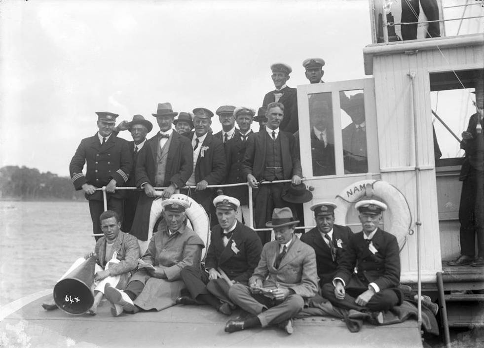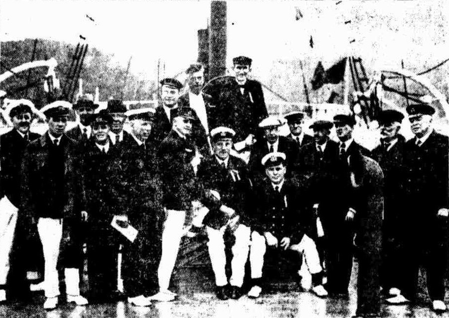 Some of the officials and yachtsmen who participated in Saturday's Pittwater regatta. They all had a merry time, and were downhearted when the two days and two nights' festivities cams to an end. Johnnie Roche, who organised the regatta, is to be seen standing in the background. Seated in the centre of the front row is Fred. J. S. Young, the vice-commodore, and a son of the founder of bowls in Australia. – Aboard the steamer Newcastle. PITTWATER NOT A PARADISE. (1924, December 30). Sydney Sportsman (Surry Hills, NSW : 1900 - 1954), p. 7. Retrieved from http://nla.gov.au/nla.news-article167169262