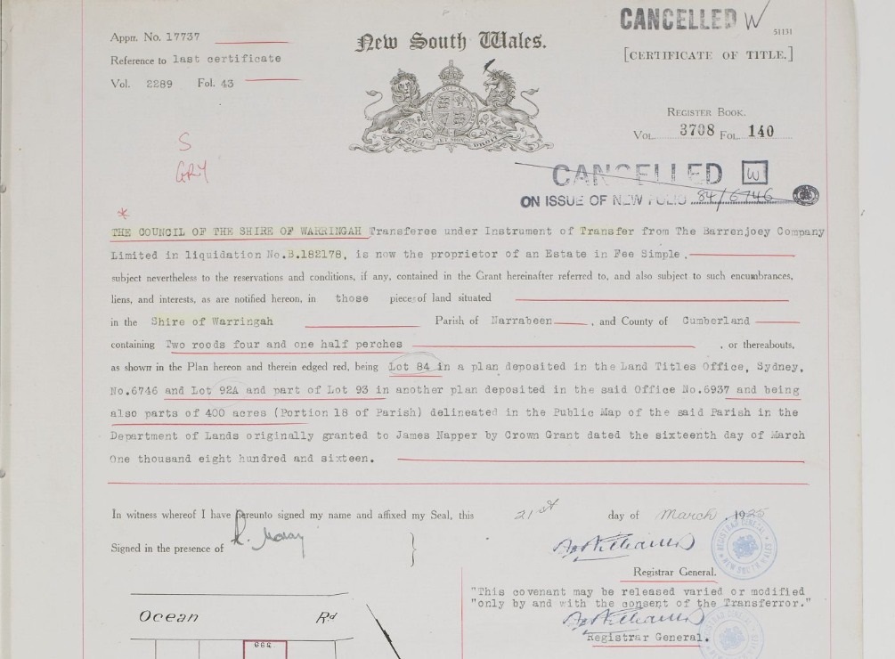 Palm Beach's beachfront was bequeathed to the council by the then Barrenjoey Land company in 1912, and they gave the whole of the beach and a reserve alongside it, as well as current day named 'Hordern Park'. Although the newspapers of the past tell us this was dedicated from the first land sales, even though this was not formalised until 1921: