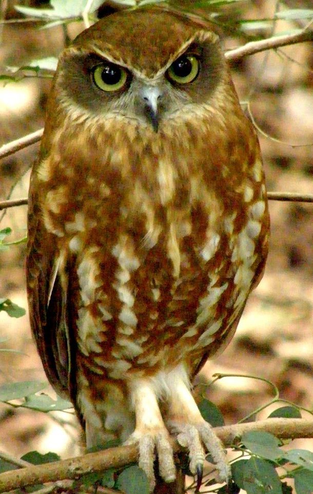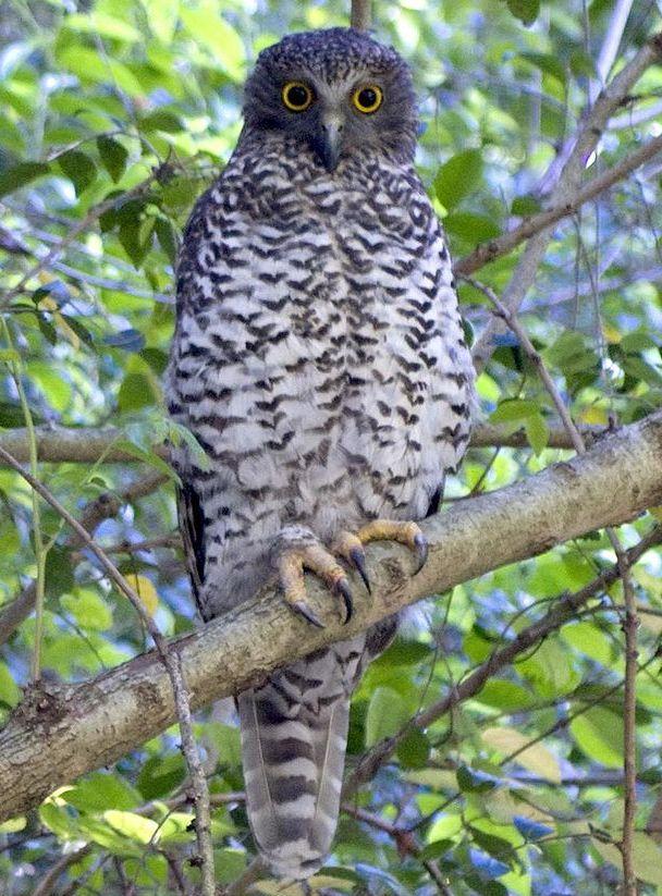 The Powerful Owl (Ninox strenua) is a similar brown to the Barking Owl but easily distinguished by horizontally barred chest stripe. The Powerful Owl is also the largest measuring 45 to 65cm.