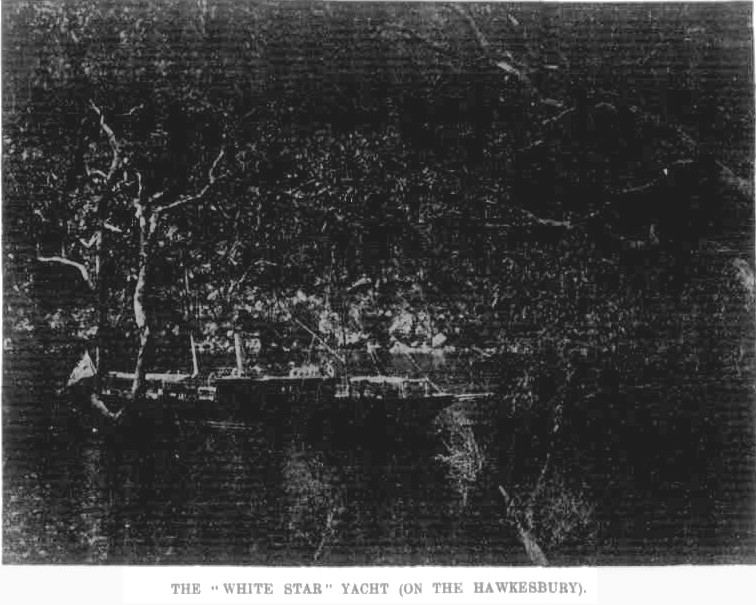 THE 'WHITE STAR' YACHT (ON THE HAWKESBURY). The "White Star" Yacht. (1896, April 25). The Cumberland Free Press (Parramatta, NSW : 1895 - 1897), p. 3. Retrieved from http://nla.gov.au/nla.news-article144436316