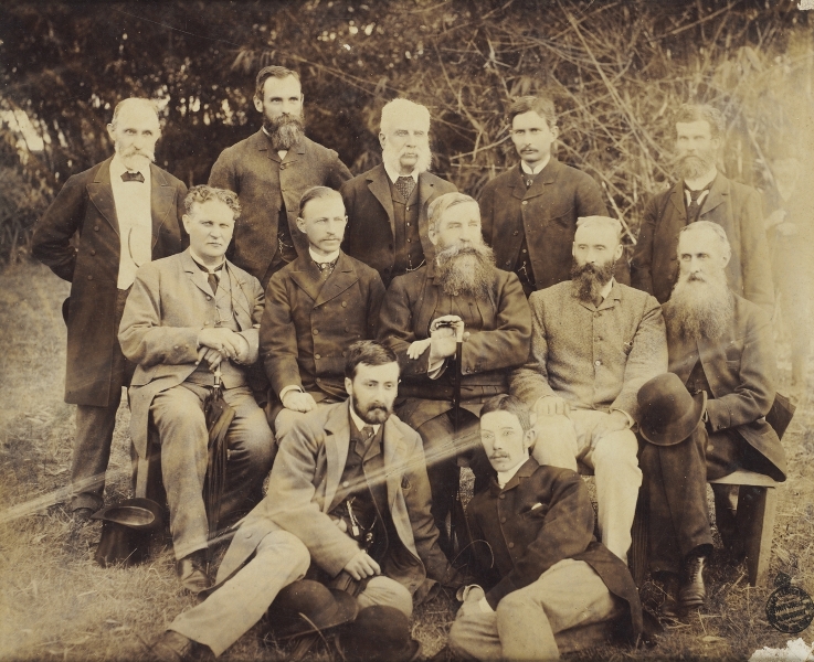The Geographical Society of Australasia, Sydney branch: the Council with Captain Everill, Included in the group are H. Maiden, Sir Edward Strickland, H.C. Everill, E.F. Fu Faur, J.F. Mann and others ca. 1885 by Kerry & Jones, Image No: a4905001, courtesy State Library of NSW.