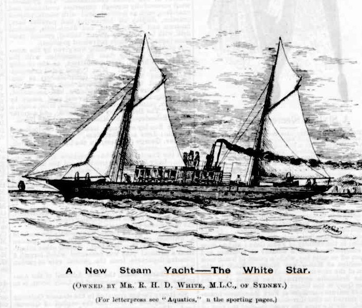 MR. R. H. D. WHITE, M.L.C., is entertaining a company of friends on board his steam yacht White Star in the vicinity of the Hawkesbury River. The vessel left Sydney at noon yesterday, and the party now on board, several of whom drove from Manly and joined the White Star at Pittwater, include Mr. Barton, the Acting Premier, Major-General Richardson, Commandant of the New South Wales Defence Force, Colonel Roberts, CMG , Major-General Tulloch, President of the Defence Commission, and his colleagues, Mr Alderman Manning, Mayor of Sydney, Mr L Mort, Mr Meeks, and Mr Cowlishaw Mr Catchett Walker, the Principal Under-Secretary, is also of the party, which is timed to return to Sydney at dusk tomorrow. The Sydney Morning Herald. (1892, July 13). The Sydney Morning Herald (NSW : 1842 - 1954), p. 4. Retrieved from http://nla.gov.au/nla.news-article13870873