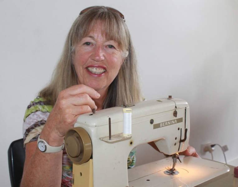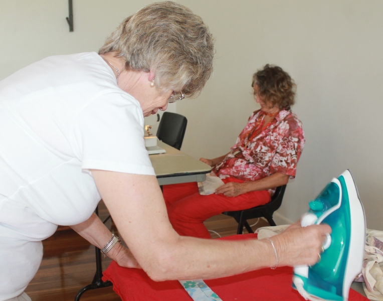 Annabelle, Laurel and Felicity on Sewing Machines, Marjee on Ironing duties, Carol, Kim and Robbi on scissors/label info duties