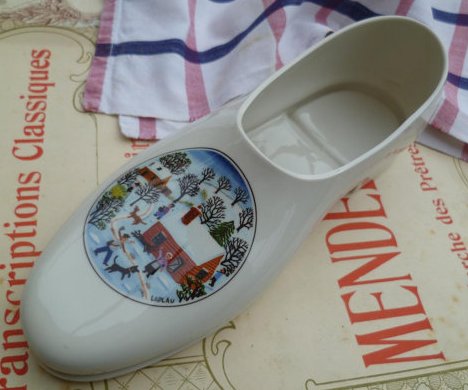 Villeroy & Boch Naif Christmas Clog Shoe Slipper Centerpiece in Fine Porcelain. Villeroy and Boch porcelain it is of the highest quality with excellent attention to detail and a finely glazed finish. The Naif pattern was Created by the artist Laplau in 1979 and has been hugely popular ever since, this particular piece is from the Christmas Variation. 8 3/4" long x 3 1/4" wide ($20.)