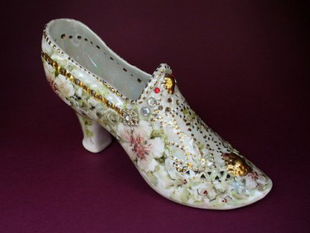 Floral Porcelain Slipper: Beautiful, hand-painted, pale pink blooms adorn this lovely porcelain slipper, as well as, 24k gold and opal luster. The top of this slipper is accented with crystals. Length: 6 1/2 inches Height: 3 1/2 inches ($55)