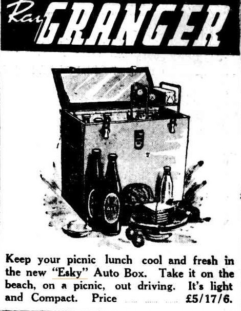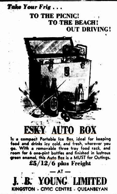 Take Your Frig . . .TO THE PICNIC! TO THE BEACH or OUT DRIVING! ESKY AUTO BOX is a compact Portable Ice Box, ideal for keeping food and drinks icy cold, and fresh, wherever you go. With a removable three tray food rack, androom for 6 one-pint bottles and finished in lustrousgreen enamel, this Auto Box is a MUST for Outings. £5/12/6 plus Freight! Display Advertising. (1953, December 8).The Canberra Times(ACT : 1926 - 1995), p. 6. Retrieved from http://nla.gov.au/nla.news-article2902571