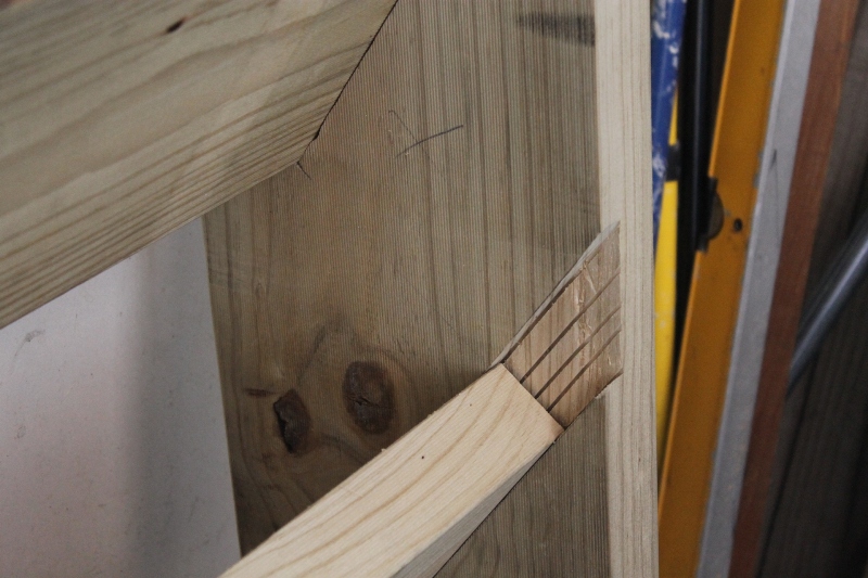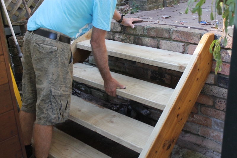 The one we built was this simple treads into stringers open version. A tread is a term for the actual step. The Stringer is the boards on either sides of the treads into which, in this version, they are slotted (For safety, Australian building guidelines state each tread has to be 250mm or wider):