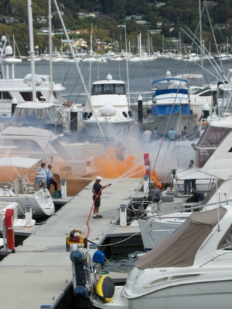 Firefighters from Fire & Rescue NSW (FRNSW) and the NSW Rural Fire Service (NSWRFS) converged on the Royal Motor Yacht Club at Newport on Wednesday for an exercise that simulated a fire spreading among boats at a marina. Having received an agenda for expected times of arrival of fire trucks from Mona Vale, Avalon and Narrabeen we can assure you that local fire-trucks, the Water Police and NSW Rural Fire Services water boats quickly arrived and brought the situation under control. A new RMYC pump that allows estuary water to be directed onto yachts tied to the seawalls and moving affected boats out and away from other craft were practised.
