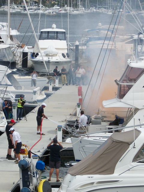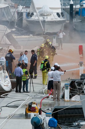 FRNSW Superintendent Kel McNamara said FRNSW firefighters would communicate with other agencies during the exercise to co-ordinate a rapid response. "Firefighters are trained to fight fires involving highly flammable materials, such as the fibreglass on modern yachts," Superintendent McNamara said. "This exercise will simulate a fire on two boats in the challenging environment of a marina, with a third boat on fire and adrift, threatening to spread the fire to other vessels and structures. Some people will be 'trapped' at the end of the wharf and others will act as casualties. Firefighters won't know what to expect until they arrive on their trucks, and rush to the wharf using hose lines, and at times portable water pumps."