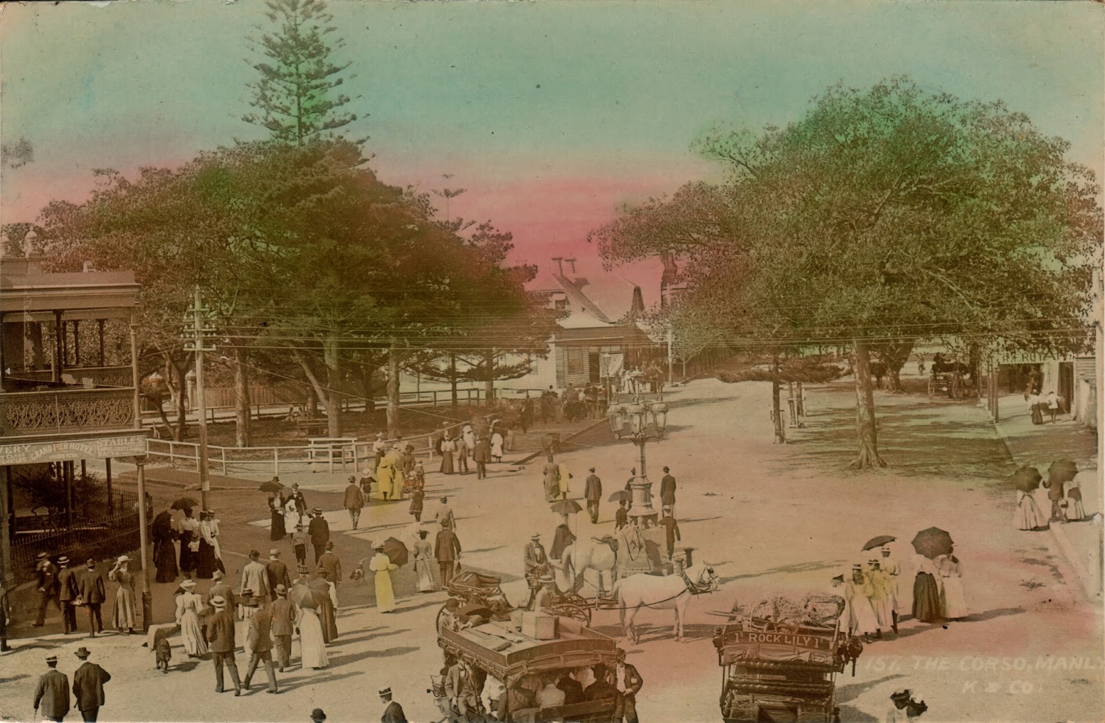 The Sydney Transit Commissioners, accompanied by a number of friends, numbering in all about 120 people had a very enjoyable picnic to the Rock Lily Hotel Picnic Ground yesterday. The party left Sydney, at…At Manly they were met by six coaches from Houreux's establishment, in which they drove down to the destination. During the forenoon foot races and various sport, were indulged in by the younger portion of the party. After dinner, served at the hotel, dancing was participated in inside the hotel. The Sydney Morning Herald. (1892, October 19 Wednesday). The Sydney Morning Herald (NSW : 1842 – 1954), p. 6. Retrieved from http://nla.gov.au/nla.news-article13883032