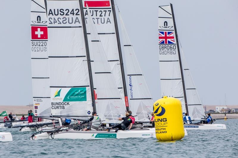 First up on the day, the Nacra 17 had to contend with some light breeze on a changing racecourse.