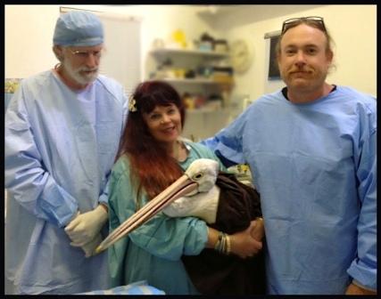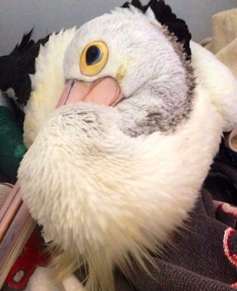 Pelicans don’t like to be watched, so you have to sidle up to them with your eyes averted and attempt to capture them ! whilst looking away... Not an easy task! After some side-stepping and fox-trotting, Tyson managed to get a blanket over Kevin’s head and bundled him into the carrier. Phew!