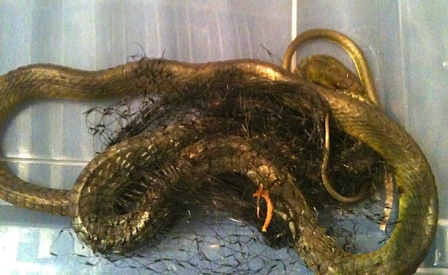 Late one Thursday night, I was called to a snake rescue in Frenchs Forest. The caller was unsure of the type of snake as it was so tangled up in fruit netting that it was unrecognisable.