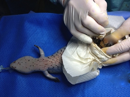 George was put under anaesthetic while we investigated the damage. Dead scales and skin was removed and Dr Ralph gave him sub-cutaneous fluids as he was very dehydrated. He was bathed again and bandaged up.