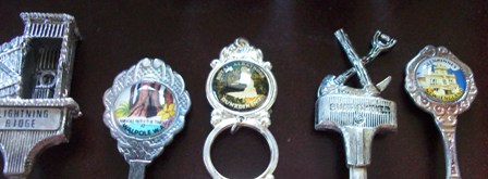 Teaspoons to celebrate your visiting a place, an establishment or local flora and fauna, are collected here, in Australian versions, and when you visit just about anywhere else. Tiny pictures of famous landmark places, small sculptures of famous bridges, buildings, events and more are attached to the top of the teaspoon handle or even are part of etchings in the bowl of the spoon itself. Some collectors build a display case fileld with small racks to show their spoons.