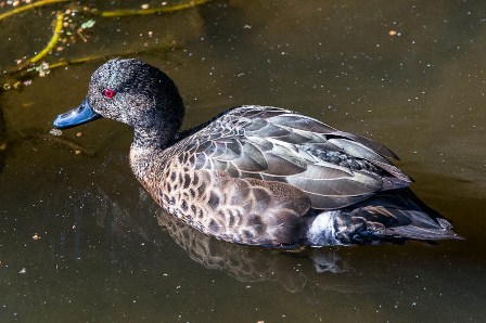 The other bird pictured here is a female or juvenile Chestnut Teal, Anas castanea, whose breeding season is July to November each year. Chestnut Teals are found on wetlands and estuaries in coastal regions, and is one of the few ducks able to tolerate high salinity waters, but still requires fresh water for drinking. It will also use open freshwater lakes, reservoirs and sewage ponds during drought seasons. It mainly breeds in coastal areas, needing hollow trees in water or short grasslands near water for nesting. Males are distinctive, having a glossy green head, chestnut brown neck, breast and flanks, dark brown upper body and wings, and a black undertail with contrasting white patch. Females are mottled dark brown and grey, with a pale throat streaked brown and a dark eye stripe. In both sexes the eye is a deep red, the bill is blue-grey and the legs and feet are green-grey. The wings have a dark glossy green to purple speculum (panel) edged white and the underwing is brown, with white wing pits.