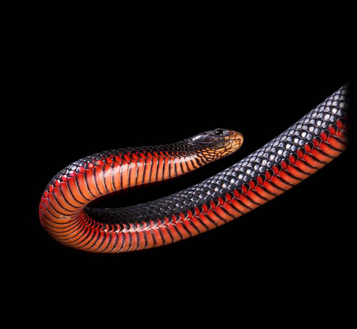 The Red-bellied Black Snake is a gorgeous glossy black on top and red on the lower sides and belly. The average-sized specimen is 1.2m - 1.5m. They are often found near water and are excellent swimmers! Their diet consists primarily of frogs.