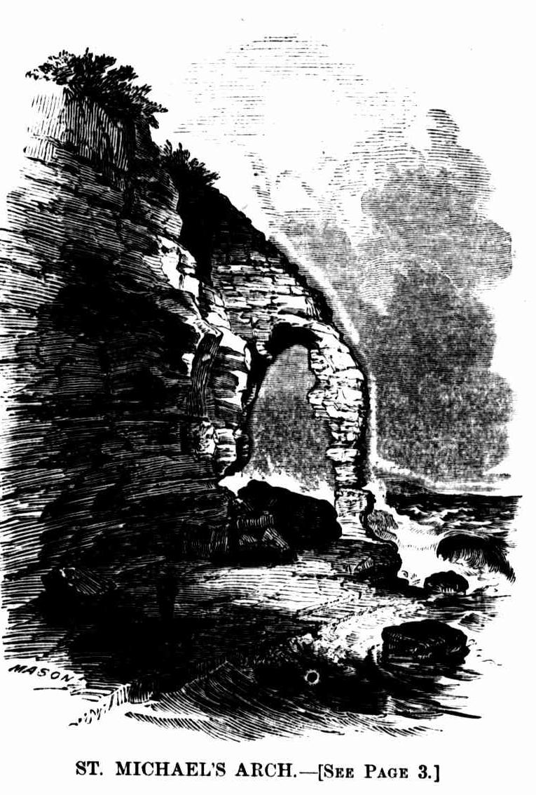 The arch mentioned by Mr. Raymond is about twenty-two feet across the inside, and between thirty and forty feet high underneath. The rocks, of which it forms a part, are seventy feet in height - the colours of these rocks are exceedingly beautiful. At low water the visitor can pass through the arch.