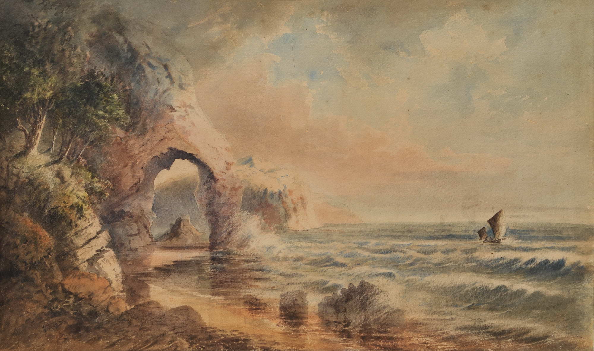 W.H. Raworth (Brit./Aust./NZ, c1821-1904). St Michael’s Arch, NSW [Avalon] c1860s. Watercolour, signed lower left, obscured title in colour pencil verso, 34.2 x 56.5cm. Tear to left portion of image, slight scuffs and foxing to upper portion. Price (AUD): $2,900.00 at:https://www.joseflebovicgallery.com/pages/books/CL181-53/w-h-raworth-c-brit-aust-nz/st-michaels-arch-nsw-avalon
