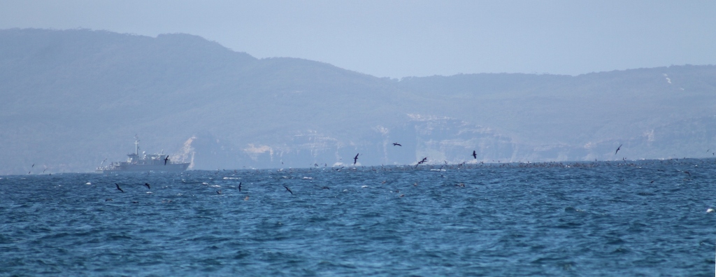 On Thursday afternoon (24.1.2013) a huge flock of Little Black Cormorants were seen fishing off Palm Beach, clearly having found a school of fish and sticking their wings up to close our January-Summer 2013 Saltwater mix with a sea bird. The Huon class minehunter HMAS Huon (M 82) is the RAN ship you can see in the background heading up the coast beyond Barrenjoey headland.