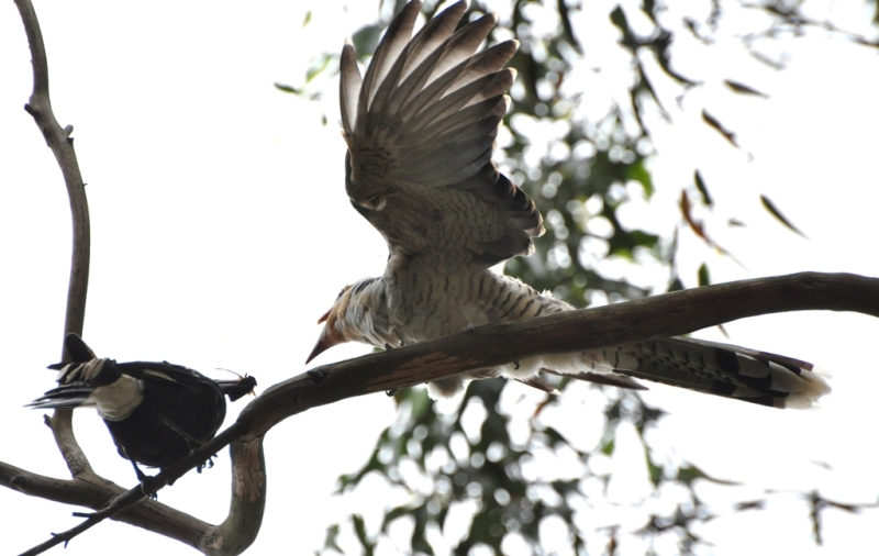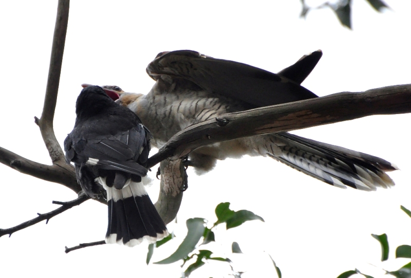 Cuckoo being fed by Pied Currawong, picture by Jeffrey Sabri.