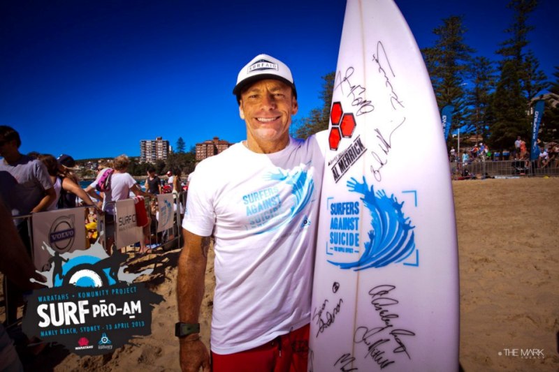 On Saturday 13th April 2013 surfers Kelly Slater, Tom Carroll, Mark Occhilupo, Simon Anderson along with Owen and Taylor Wright joined NSW Waratahs rugby players on Manly beach for a celebrity surfing competition. The Komunity Project Surf Pro Am tournament’s aim was to raise money for the charity Surfers Against Suicide (SAS).