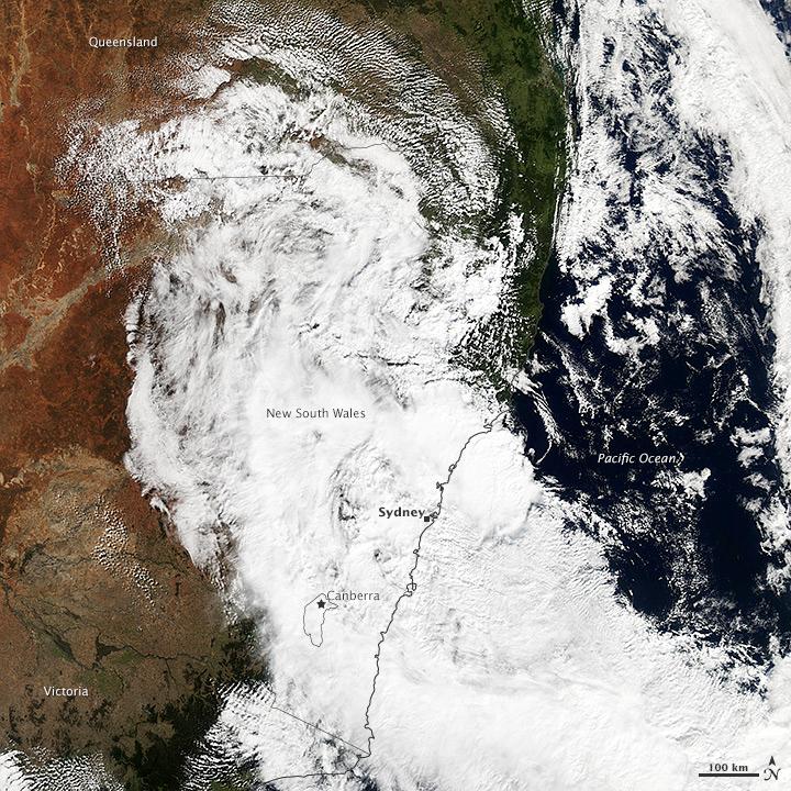 Strong wind and heavy rain battered Sydney and other areas of Australia’s New South Wales from April 20-22, 2015. The Moderate Resolution Imaging Spectroradiometer (MODIS) on NASA’s Aqua satellite acquired this image of the storm on April 21. NASA Earth Observatory image by Jesse Allen, using data from the Land Atmosphere Near real-time Capability for EOS (LANCE). Caption by Kathryn Hansen.