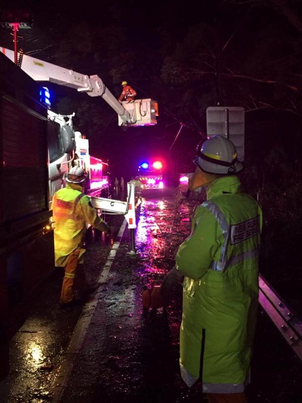 Right: Nightwork - Tumbledown Dick RFS image: 'Mona Vale Rd, Ingleside. Tree threatening to fall into roadway. With assistance of a passing cherry picker, RFS worked to remove hazards to MV Rd.'