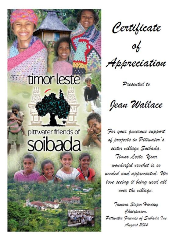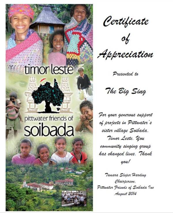 Pittwater Community has really got behind our projects in so many varied ways. Recently we acknowledged some of these special people with the presentation of certificates of thanks. Samantha Shaw's Big Sing Community Singing Group sung for Soibada on many occasions. The money they have raised enabled us to meet some of the needs of our sister village. They also help spread the word - the more people that know about Soibada the more we can do!