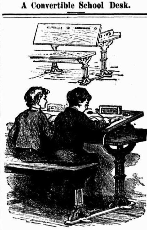 This 1887 'new fangled desk' was improved so it could have a place for a slate!: