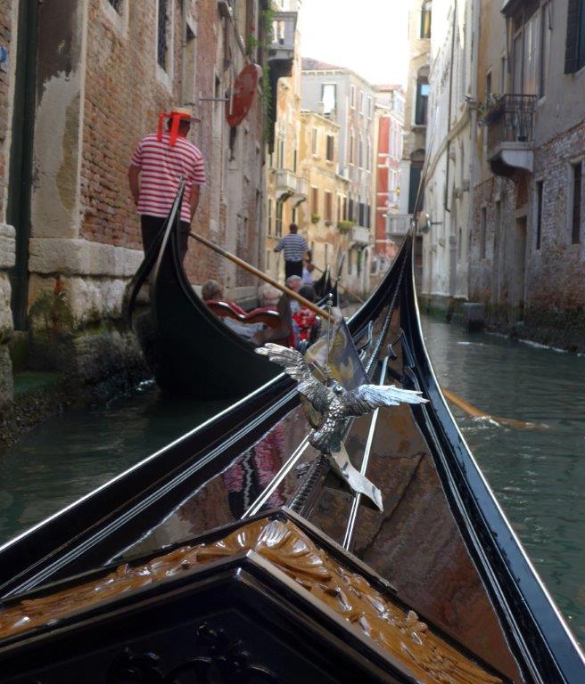Gondolas are handmade and are composed of 280 pieces using eight different woods. The port side is longer than the starboard side providing asymmetry to resist the tendency to turn left at the forward stroke of the gondolier as he propels it first with a forward stroke followed by a backward stroke. The gondolier stands at the stern of the gondola facing the bow, using the oar, which is made of birchwood, in a distinctive way. For the gondola to be poled like a punt would be quite impractical because of the depth of the canals. As can be imagined with a craft of such a long history associated with Venice every detail of the gondola has an interesting symbolism, which is well worth reading about.