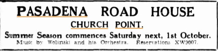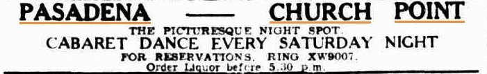 Pasadena, at Church Point, which before the war was one of Sydney's most exclusive roadhouses, is to re-open - redecorated, refurnished. SYDNEY NIGHT CLUBS. (1946, July 8). Cairns Post (Qld. : 1909 - 1954), p. 2. Retrieved from http://nla.gov.au/nla.news-article42501575