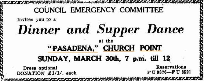 Church Point wine and spirit store (owner Ernest Caldwell) licensee, Harry Jackson, admitted blackmarket sales of 75 percent of supplies, including some sales to the Pasadena Club. Pasadena Club. Church Point, alleged blackmarket purchases from Harry Jackson.Judge's Demand For Details On 'Black' Beer Sales. (1952, April 13). Truth (Sydney, NSW : 1894 - 1954), p. 8. Retrieved fromhttp://nla.gov.au/nla.news-article167979371