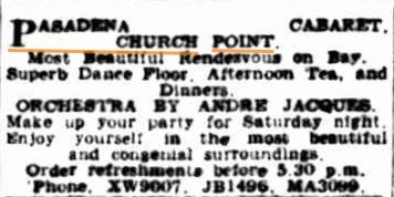 PASEDENA CABARET CHURCH POINT. Most Beautiful Rendezvous on Bay. Superb Dance Floor. Afternoon Tea and Dinners.ORCHESTRA BY ANDRE JACQUES. Make up your party for Saturday night. Enjoy yourself In the most beautiful and congenial surroundings. Order Refreshments Before 5 30 p m. Phone XW9007 JB1496 MA3099. Advertising. (1950, June 21). The Sydney Morning Herald(NSW : 1842 - 1954), p. 13. Retrieved from http://nla.gov.au/nla.news-article18164276