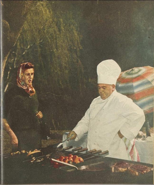 At Audley, near Sydney, Princess Alexandra had lunch on the river bank after visiting the Junior Red Cross Home at Cronulla. She wore a green wool jumper-suit, and before the picnic exchanged her flowered hat for a silk scarf and her high heels for suede brogues. Here, beside the trees and racing river, she is at the barbecue with Gerry Kearney, honorary chef of the Beefsteak Club of N.S.W. Picture is by staff photographer Keith Barlow. PRINCESS AT PICNIC. (1959, September 30). The Australian Women's Weekly (1933 - 1982), p. 3. Retrieved from http://nla.gov.au/nla.news-article43737323