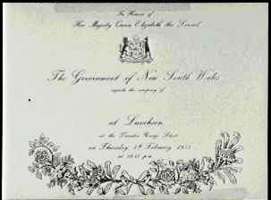 Invitation, Trocadero luncheon, Royal Tour, 4 Feb 1954 from collection of official passes and invitations relating to the Royal Visit to NSW 1954, printed by A H Pettifer, NSW Government Printer, Sydney, Australia, 1954 . Courtesy Powerhouse Museum