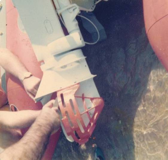 Rod Lanker of the ‘Wilson’ group made a propeller guard from ¼” mild steel just like a cage but this took too much performance from the craft (figure 11). So experiments with various ideas took place until 1975, the United Permanent Building Society donated $7,000 to NSW State Centre for the development of a safe propeller guard. This enabled us to go to professional engineers and have them design one. They first made one with protection at the front and back, but the performance loss was too much, so only the front was used successfully. Six of these were made and given to the various clubs for testing. figure 12. The testing was done between two moored buoys and timed with various loads of up to 5 people.