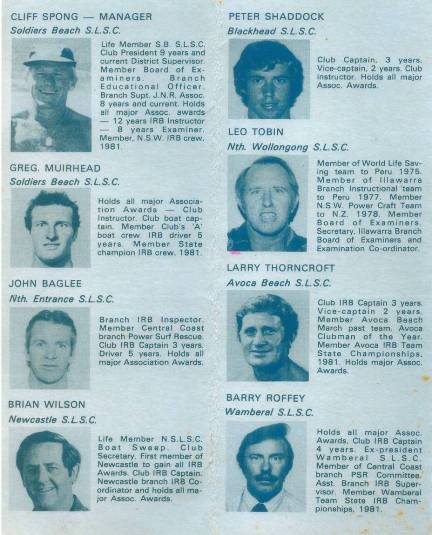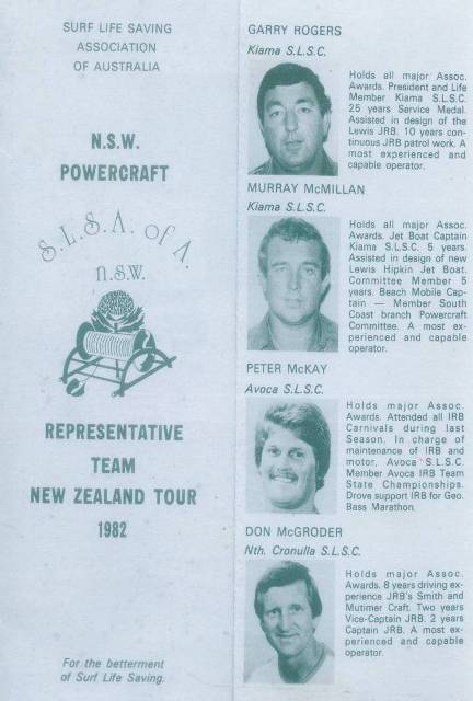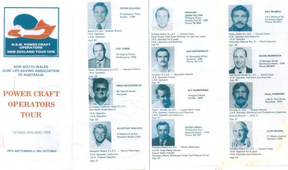 1978, under the leadership of John Fallon, we sent a team to New Zealand, a photo of the team is displayed on Figure 15/16, Men were selected mostly as a reward for their imput into rescue craft development. They visited all beaches where duckies and jet boats were in use to gain further knowledge.
