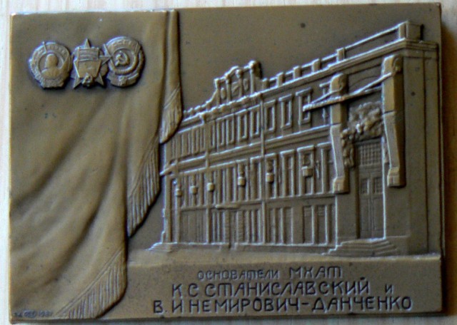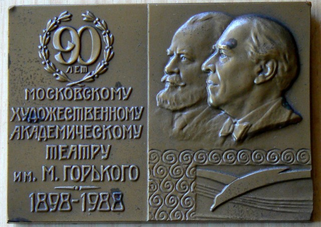 The Moscow Art Theatre (sometimes called the Chekhov Theatre) was established in 1898 by Stanislavsky (renowned for his new approach to acting technique based on the principle of “psychological realism”) and Nemirovich Danchenko. The Seagull, as the theatre’s first successful production in 1898 has a close sentimental association with the theatre whose emblem includes a representation of a seagull. To celebrate its 90th Anniversary in 1988 a commemorative plaque was struck showing on the face Stanislavsky and Nemirovich-Danchenko in bas relief with the theatre’s seagull logo, and on the obverse the façade of the theatre.