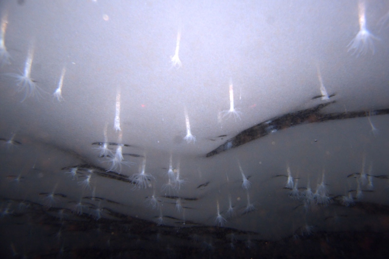 ANDRILL Anemone: Discovery on Ice Edwardsiella andrillae Location: Antarctica A species of sea anemone, living under a glacier on the Ross Ice Shelf in Antarctica, raises questions by its very existence. It is not clear how the species withstands the harsh conditions in its habitat. It is the first species of sea anemone reported to live in ice. It was discovered when the Antarctic Geological Drilling Program (ANDRILL) sent a remotely operated submersible vehicle into holes that had been drilled into the ice. This revealed the presence of small creatures, less than 2.5 centimeters long (one inch) with most of their pale yellow bodies burrowed into the ice shelf and their roughly two dozen tentacles dangling into the frigid water below.